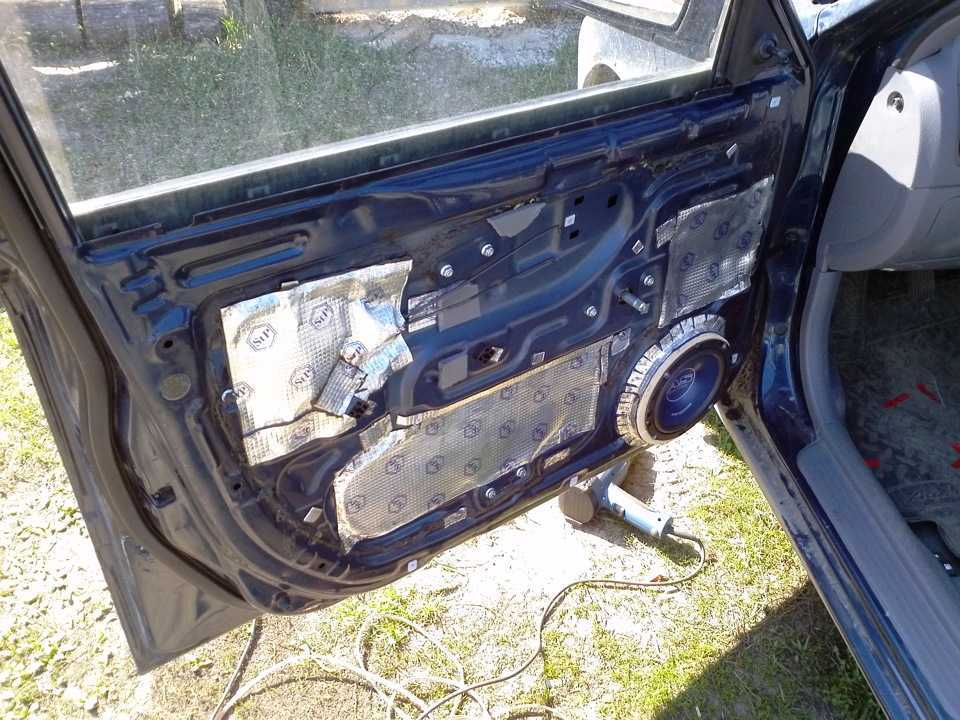 , шумка одних лишь дверей недостаточно. Работа не занимает много времени, вполне можно справиться и одному. Если делает профессионал, да еще и не один, то работа будет сделана за очень короткое время, рекомендуется заранее приготовить все инструменты и материалы, которые пригодятся в процессе выполнения работы. Так же работать нужно в теплом помещении, клей должен все схватить, а в холодном месте он попросту застынет. Размер отверстий подбираем по диаметру колонок, устанавливаемых на автомобиль. Все контакты нужно хорошо изолировать, для того, чтобы предотвратить возгорание.