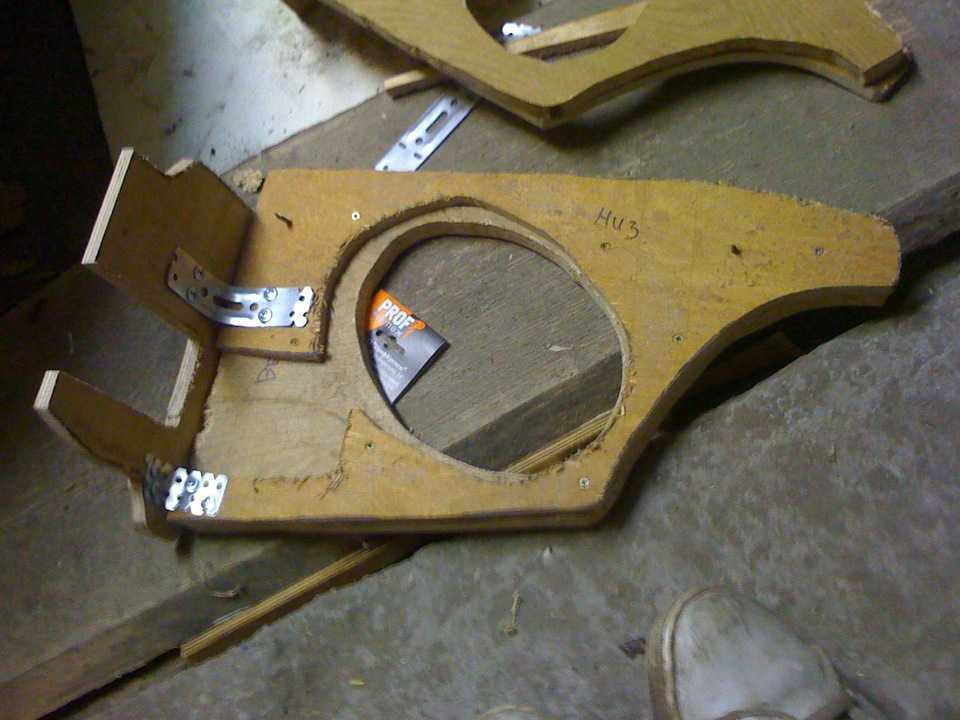 После того, как были вырезаны все части боковинок, они были скреплены саморезами, а «горбушка» прикручена к основной части боковинки при помощи металлических подвесов.