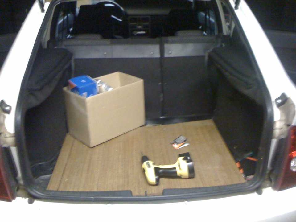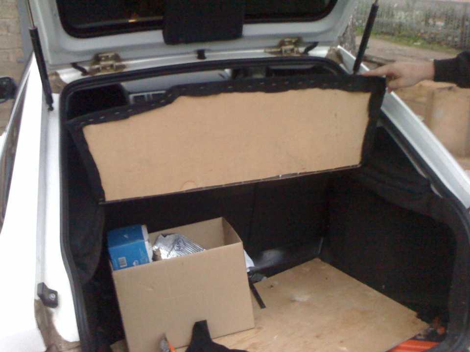 сверху закрепить отрезок ДСП параллельно полу багажника, к нему с помощью уголков – меньший, перпендикулярный первому. Снизу, между крайними горизонтальными точками – вертикальную деталь, которая будет предотвращать перемещение положенных внутрь предметов по полу.