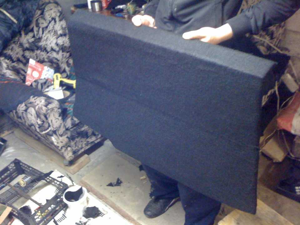 На следующий день попытались усадить колонки в боковинки, как обычно — сверху, оказалось что немного не угадали с размерами отверстий под колонки, но это было не страшно, просто закрыли отверстия секретной сеточкой)) и обтянули сверху карпетом, а колонку усадили снизу. Каким образом обтягивали карпетом — был куплен клей момент монтаж, а так же одолжен степлер строительный. Верхнюю часть боковинки обмазали клеем и приложили карпет, потом с небольшим усилием обтянули края и снизу пристрелили скобами.
