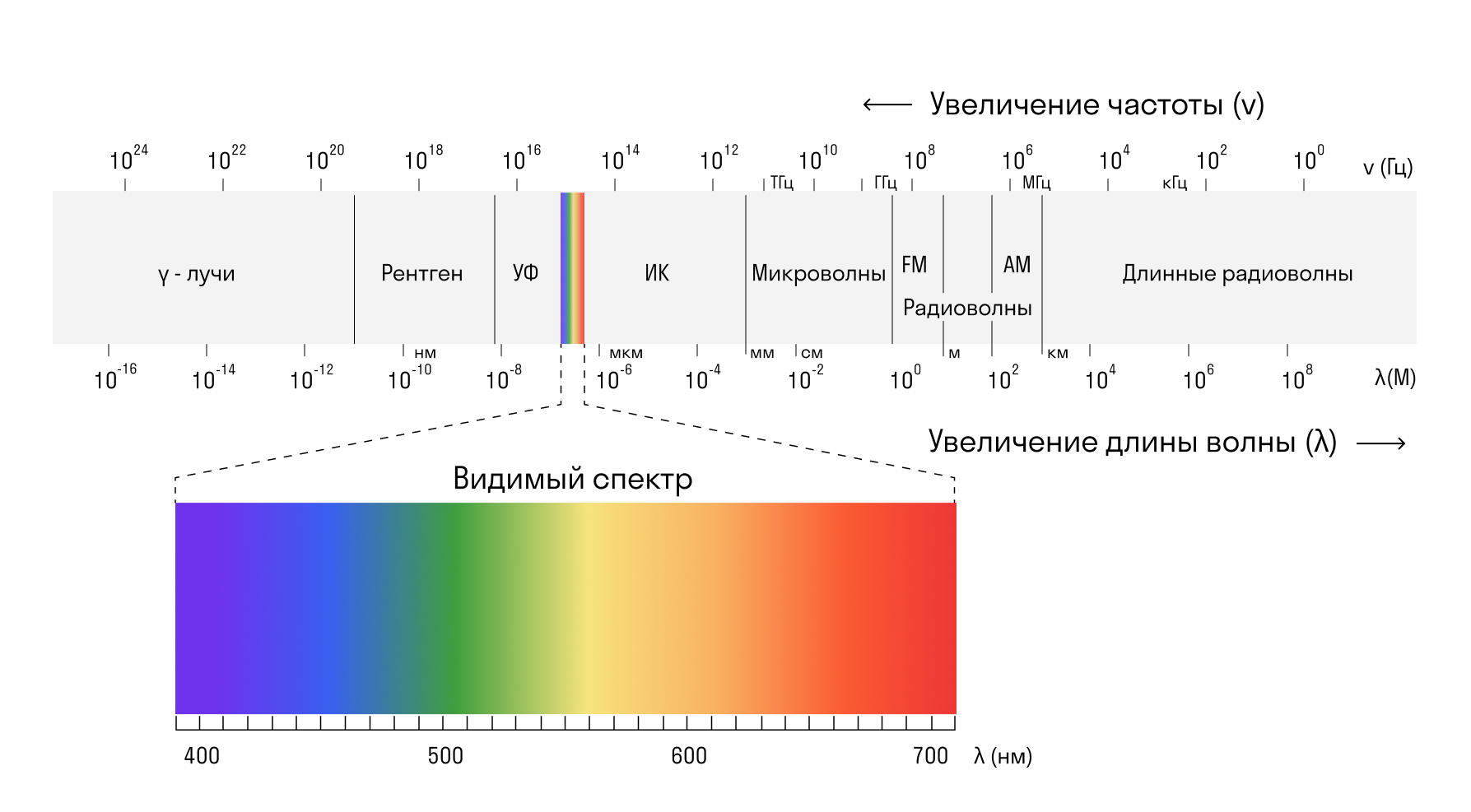 Для электромагнитных волн есть целая шкала длин волн. Она показывает длину волны и частоту для разных типов электромагнитных волн.