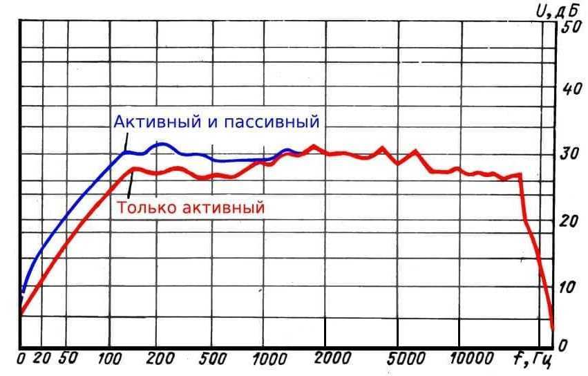 На графике видно, что при наличии пассивного излучателя, АЧХ акустической системы значительно повышается в диапазоне от 20 до 500Гц. А это и есть низкочастотная область, т.е. те самые басы.