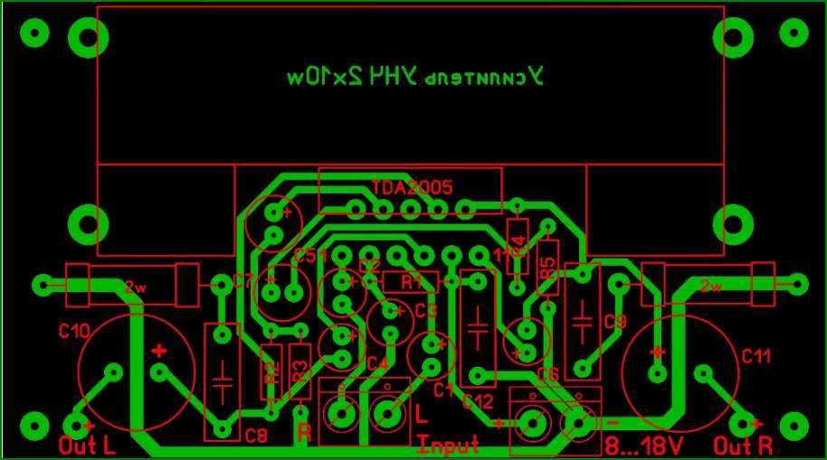 В схеме усилителя микросхему обязательно надо ставить на радиатор не менее 100см2. Конденсаторы электролитические напряжением 16-25v. Конденсаторы С8,С9,С12 пленочные, напряжением 63v. Резисторы R6,R7 мощностью 1 Вт, остальные 0,25Вт. Переменный резистор R0- сдвоенный, сопротивлением 10-50 ком.