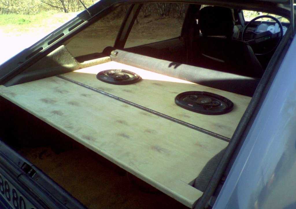 Примечание. Минусы магазинных акустических полок как раз в том, что они не имеют правильного направления динамиков. Установленные в предназначенные для них места, колонки на магазинной акустической полке имеют направленность в потолок, где ворсистый материал гасит часть звука. Если еще учесть расположение подголовников и сидящих пассажиров, то эффекта отраженного звука практически добиться будет невозможно.