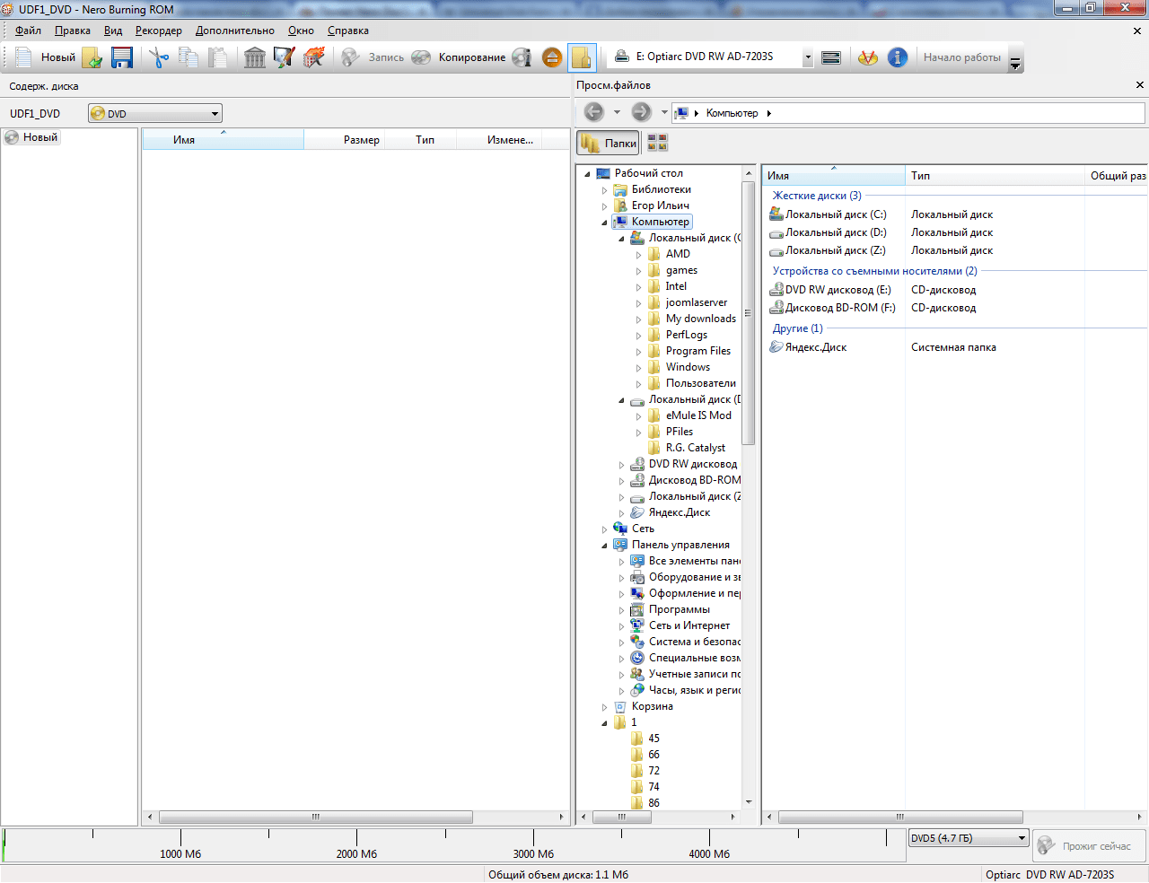 . Перед нами появится рабочее окно Nero Burning ROM. Это окно условно разделено на две части. Слева – файлы, находящиеся на нашем диске (пока что пусто), а справа – все файлы, которые находятся на локальном компьютере.