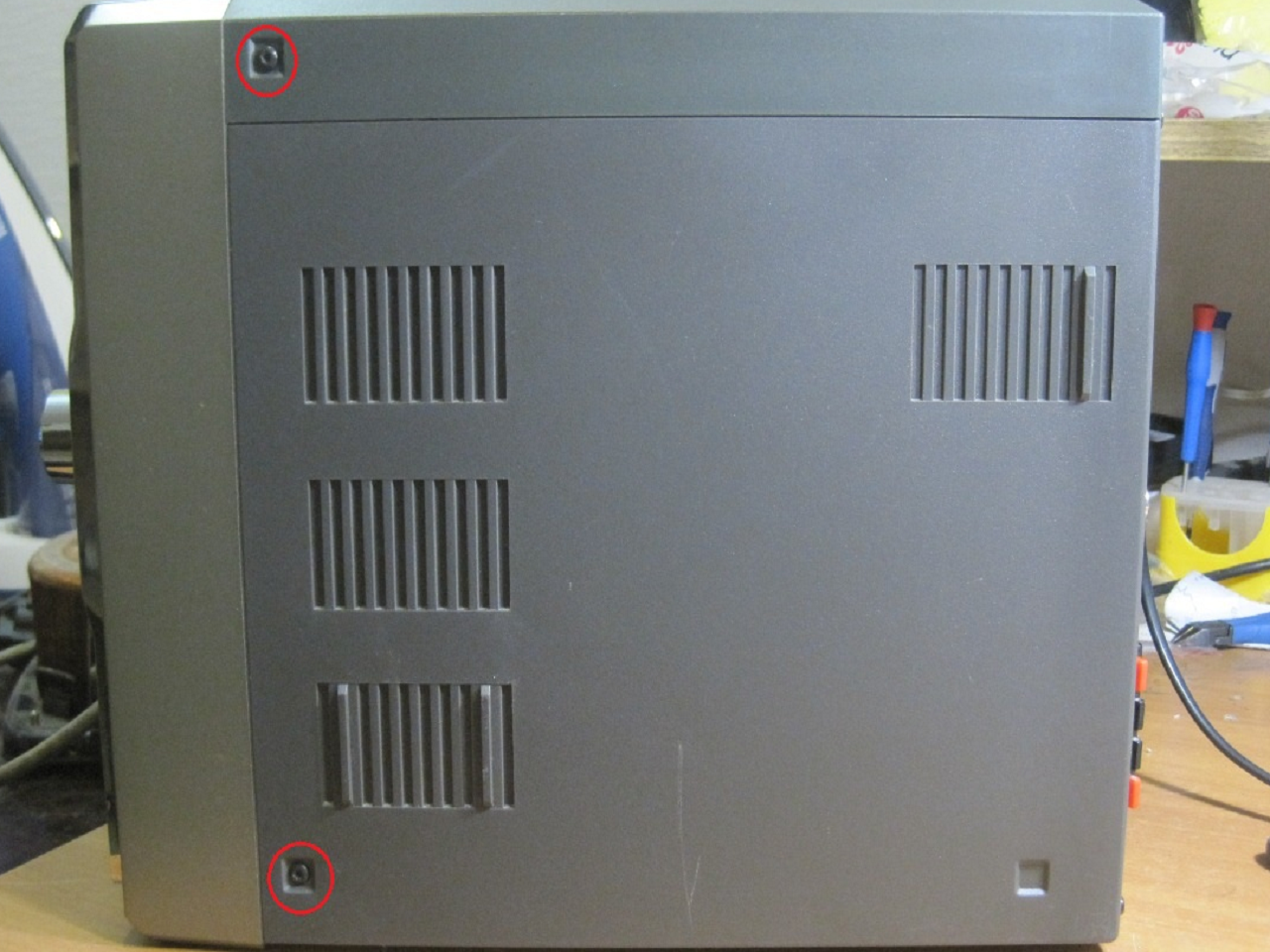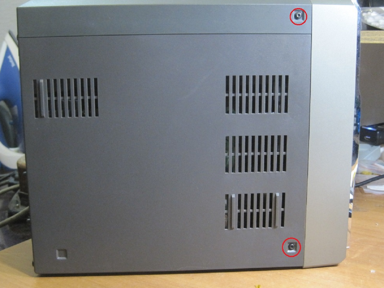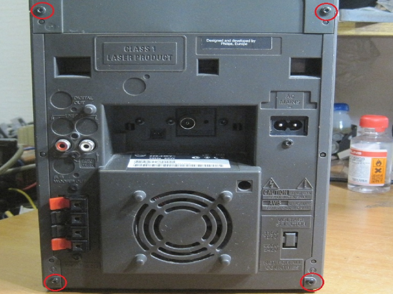 Для того, чтобы отремонтировать магнитофон Philips MCM8/22, нам понадобится шестигранная отвертка. На фото ниже показаны шурупы, которые надо выкрутить, чтобы снять корпус. Выкрутив все шурупы, сначала снимается верхняя часть музыкального центра, потом уже боковые.