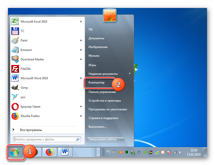 - Для этого подключите флешку к компьютеру, а затем через главное меню, ярлык на «Рабочем столе» или кнопку «Пуск» перейдите к разделу «Компьютер».