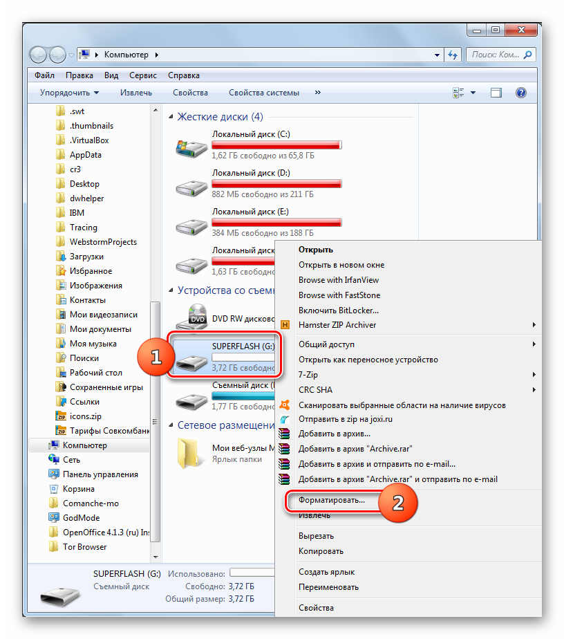 - Перейдите в окно «Компьютер», где отображаются подключенные диски. Сделать это можно так же, как было описано, когда мы рассматривали процедуру проверки текущей файловой системы. Щелкните ПКМ по наименованию той флешки, которую планируется подключить к магнитоле. В открывшемся перечне выберите «Форматировать…».
