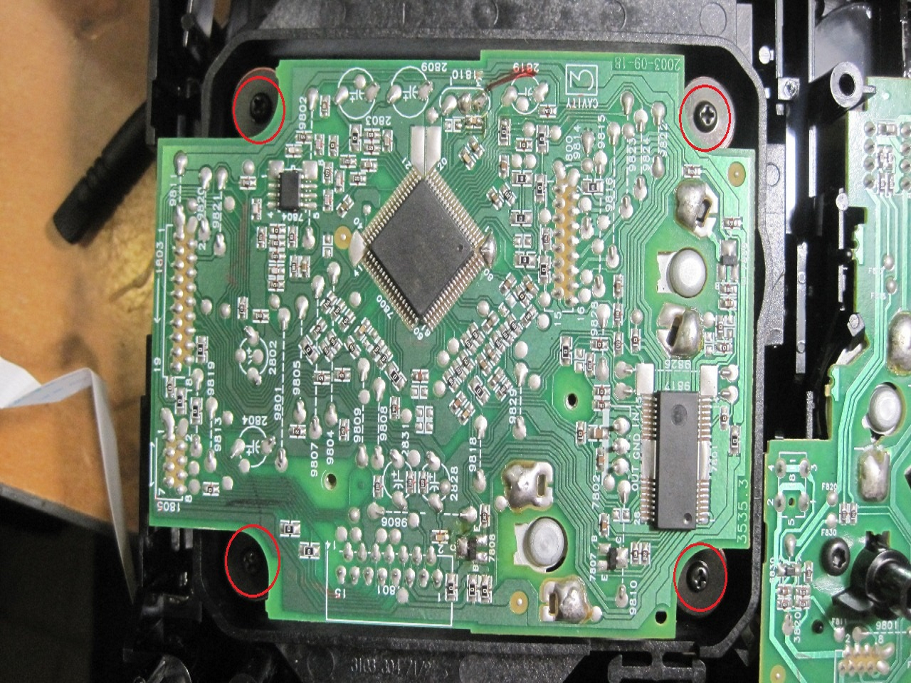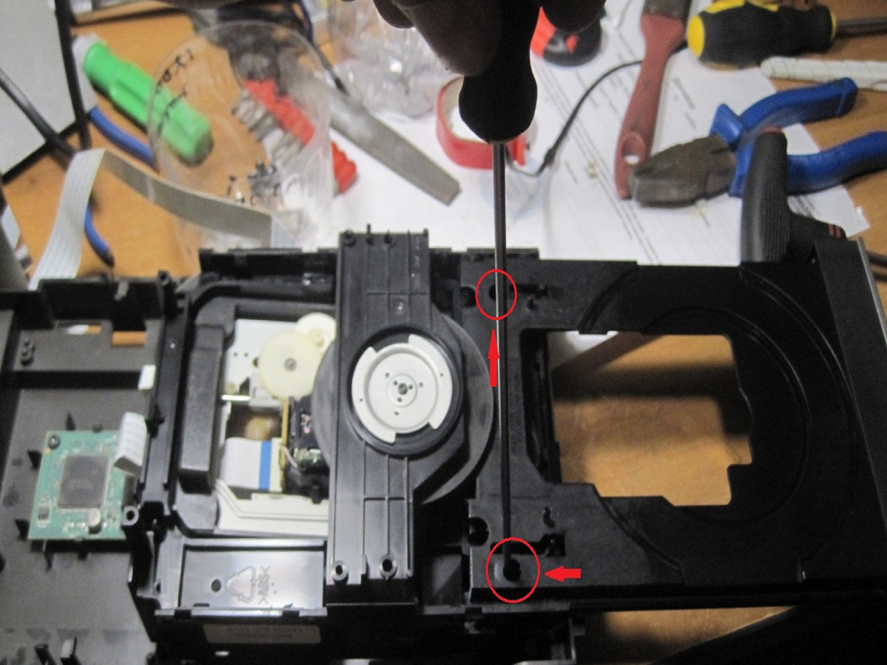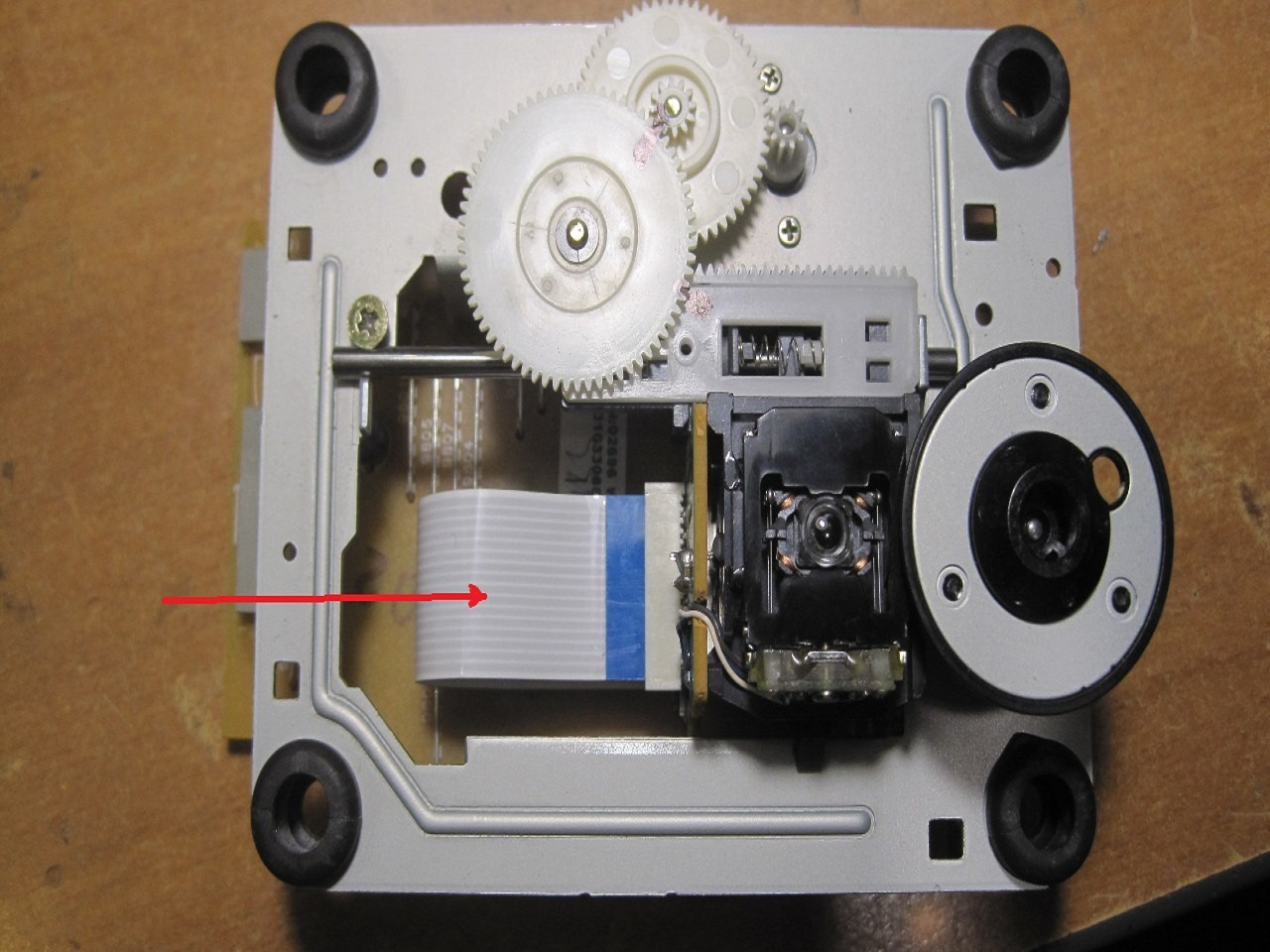 На следующей фотографии мы видим механику привода и головку CD-лазера. На ней же красной стрелочкой указан шлейф, который следует заменить, если чистка линзы не привела к успеху.