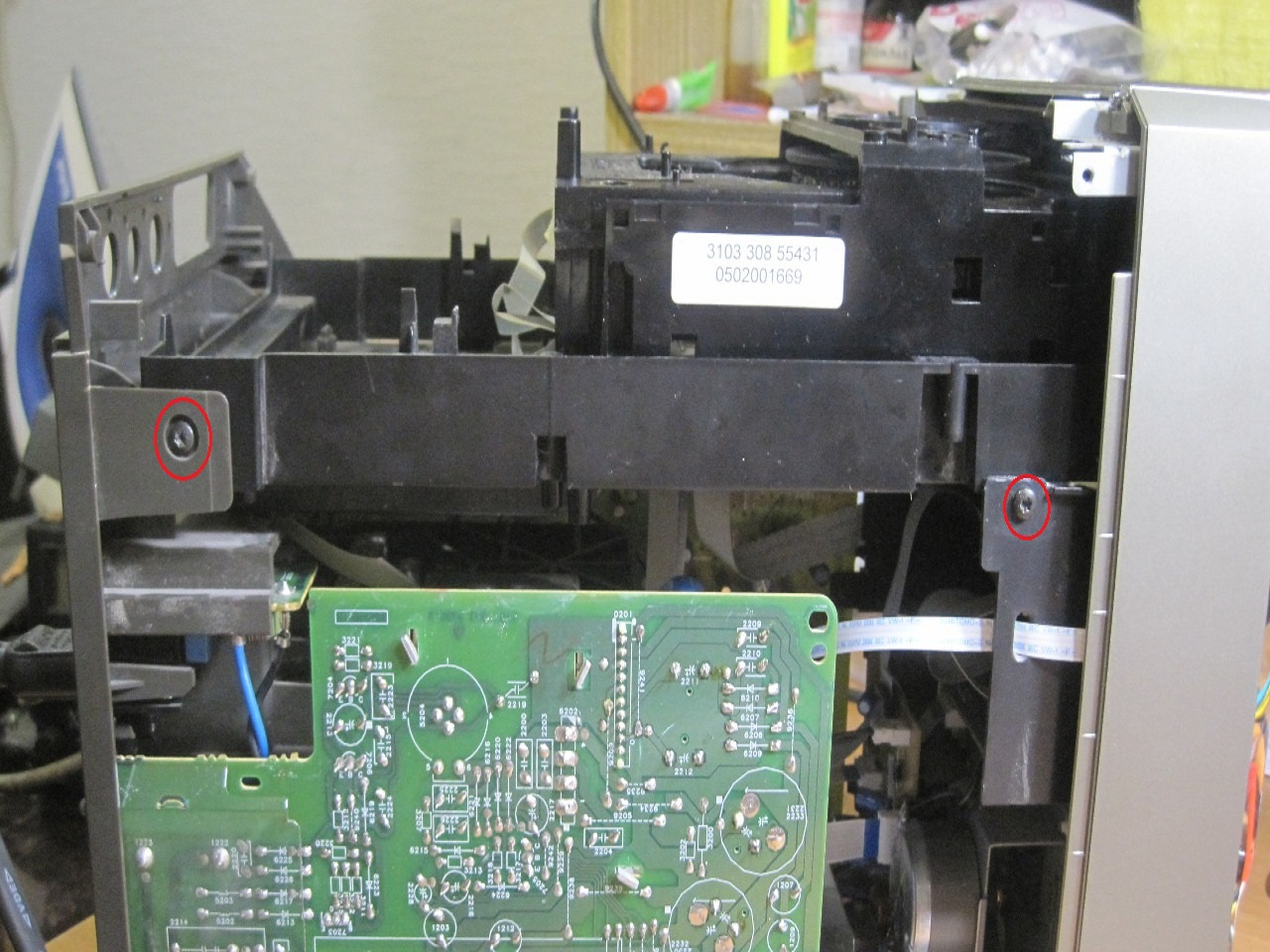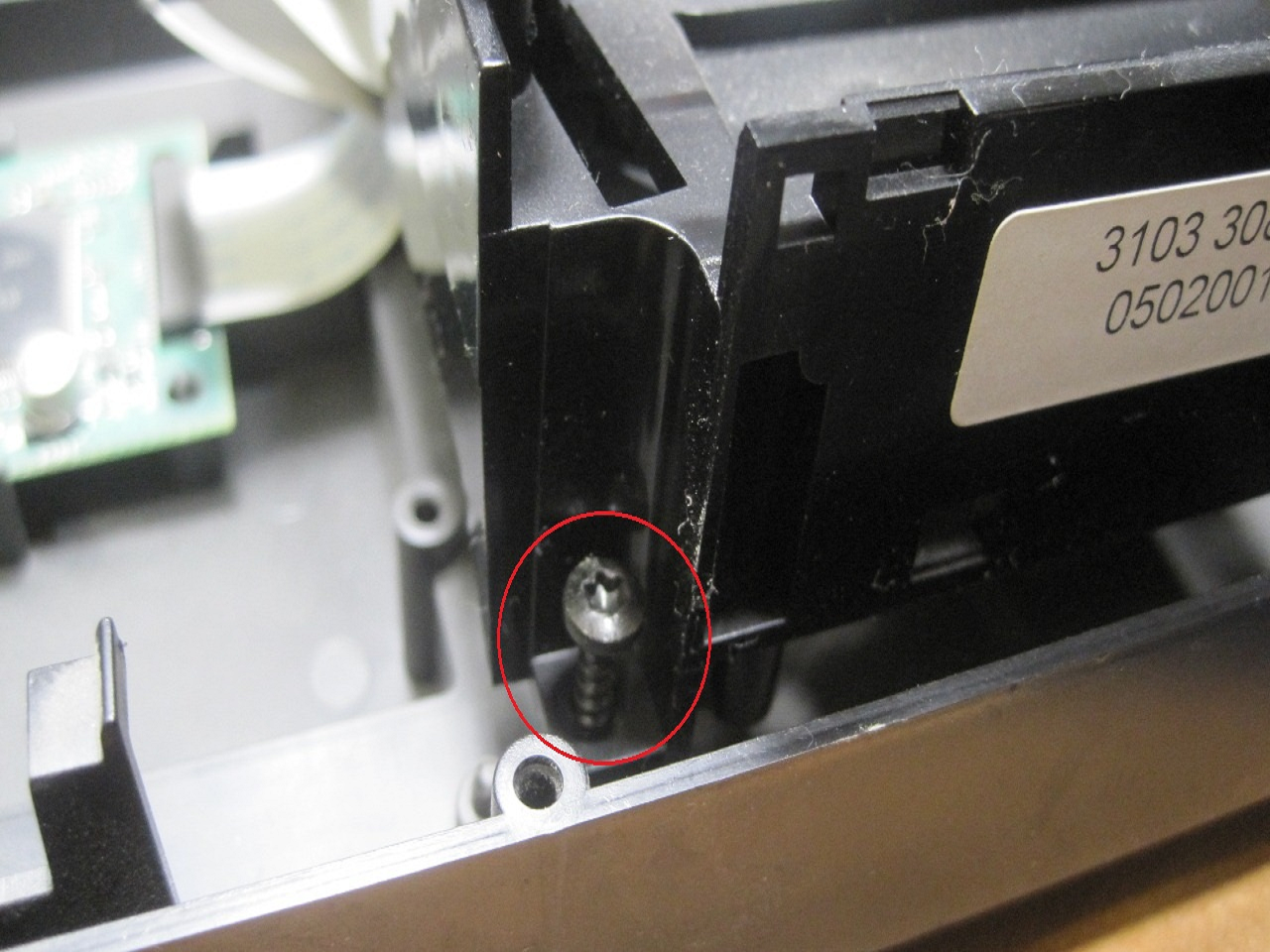 На фотографии ниже показаны скрытые шурупы, но для того, чтобы добраться до них, нужно выдвинуть дисковод.