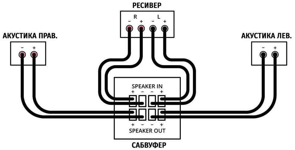 Сабвуфер подсоединяют к выходам ресивера, а акустику — к выходам сабвуфера. Перед этими выходами находятся высокочастотные фильтры, которые избавляют от лишних шумов, хрипов, резонансов и поддерживают качественный звук. При этом увеличивается нагрузка на всю акустическую систему, из-за чего она может сломаться.