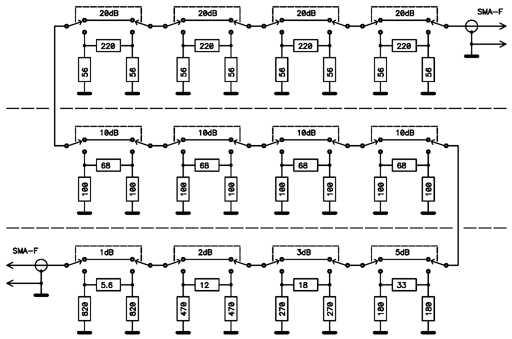 В источнике приведены следующие формулы для расчёта номиналов элементов: В каждой точке выхода такой модели аттенюатора внутреннее сопротивление равно сопротивлению нагрузки Rн. Величина аттенюации одинакова для всех ступеней и может быть выбрана любой величины. Любой, да не очень! Детальное рассмотрение схемы выявило корректную работу аттенюатора, только при значениях аттенюации, кратных 10. К тому же этот параметр рассчитывается при отсутствии нагрузки в режиме холостого хода, т.е. при её включении — добавляются дополнительные 6дБ ослабления сигнала. А вот количество ступеней ослабления может быть выбрано любым.