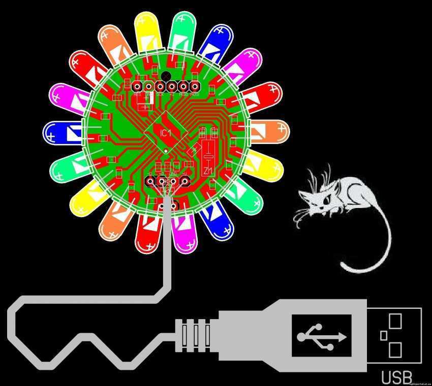 Также нам может понадобиться макетная плата для подключения USB. Самым популярным, дешевым, но при этом функциональным вариантом для подключения является модель AVR-USB-MEGA16 под USB 1.1. Эта версия USB считается уже несколько устаревшей т.к. передает сигнал к светодиодам со скоростью 8 миллисекунд, что для современной техники слишком медленно, но, поскольку человеческий глаз и эту скорость воспринимает как «мгновение ока», то нам она вполне подойдет.