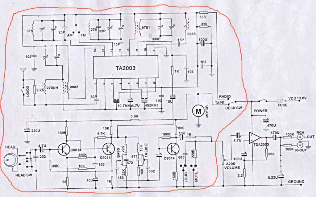 Как собрать усилитель звука из магнитолы можно понять по рисунку. Автомобильная магнитола ZXM8330-PA собрана на двух микросхемах и трёх транзисторах. FM тюнер собран на микросхеме ТА2003, а оконечный усилитель на микросхеме TDA2003. Радиоприёмную часть и первый транзистор в каскаде предварительного усиления сигнала с магнитной головки можно сразу исключить. Провод питания электродвигателя так же нужно обрезать. Так же перерезается печатная дорожка питания тюнера, идущая от переключателя «Radio»-«Tape» и дорожка с выхода микросхемы на коллектор второго транзистора. С оставшимися элементами схемы можно экспериментировать. Если внешнее устройство, которое будет подключаться к усилителю, имеет достаточно мощный выходной сигнал, то его следует подключать к верхнему по схеме выводу переменного резистора «VOLUME»