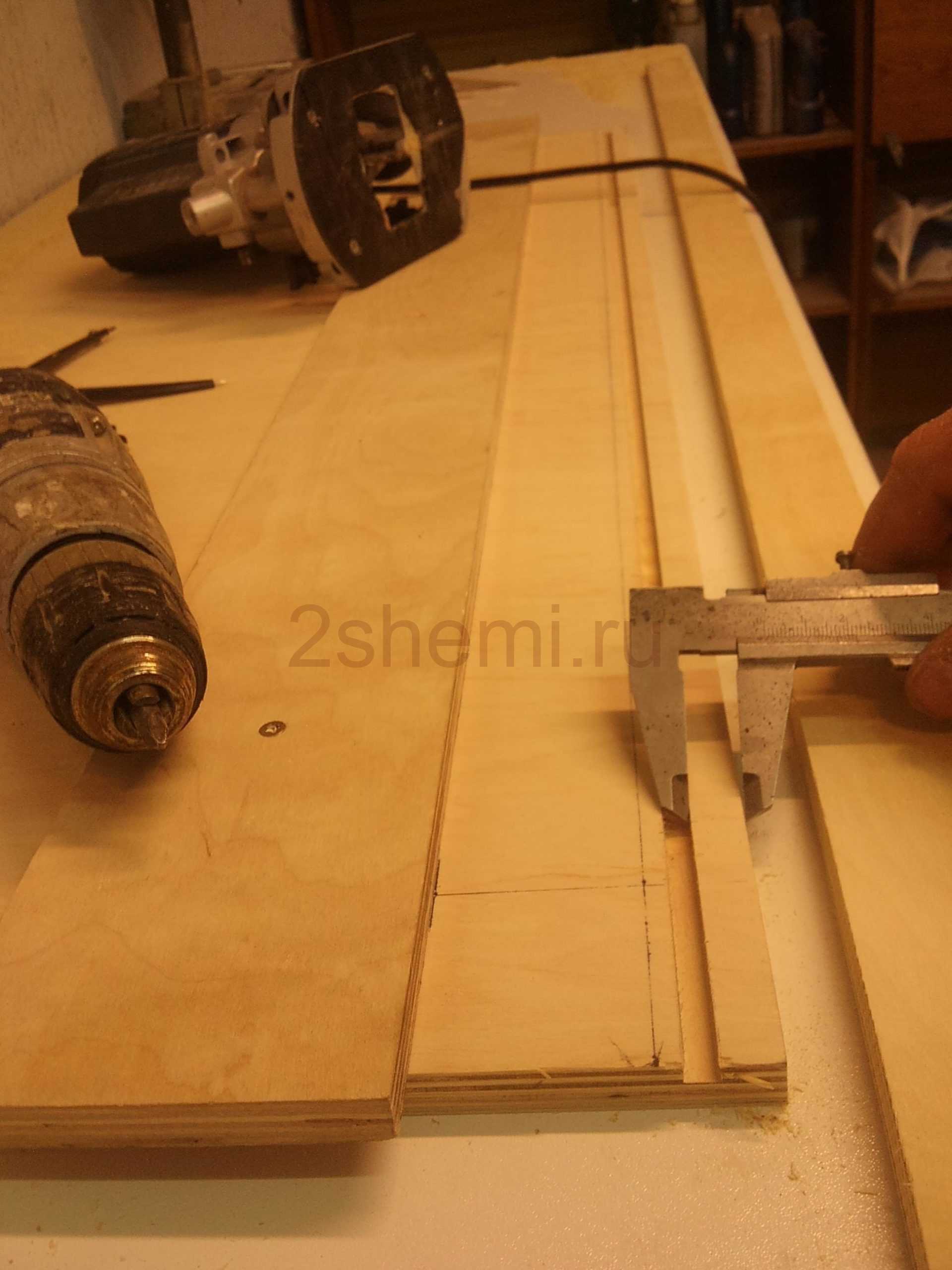 - Прикрутите направляющие двумя винтами (прямая полоска, например из фанеры) к куску фанеры и проведите линии вдоль направляющей на поверхности ручкой (проведем линию, где она прилипает к доске).