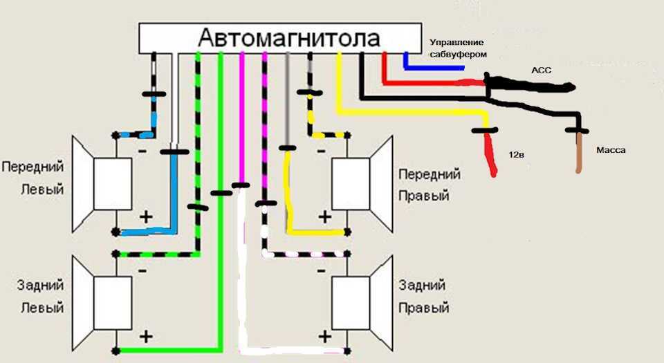 В ходе монтажа магнитолы соединение происходит следующим образом: каждый контакт с одной стороны подсоединяется к акустической системе, с другой стороны — с питанием. Такая система называется распиновкой разъемов автомагнитол.