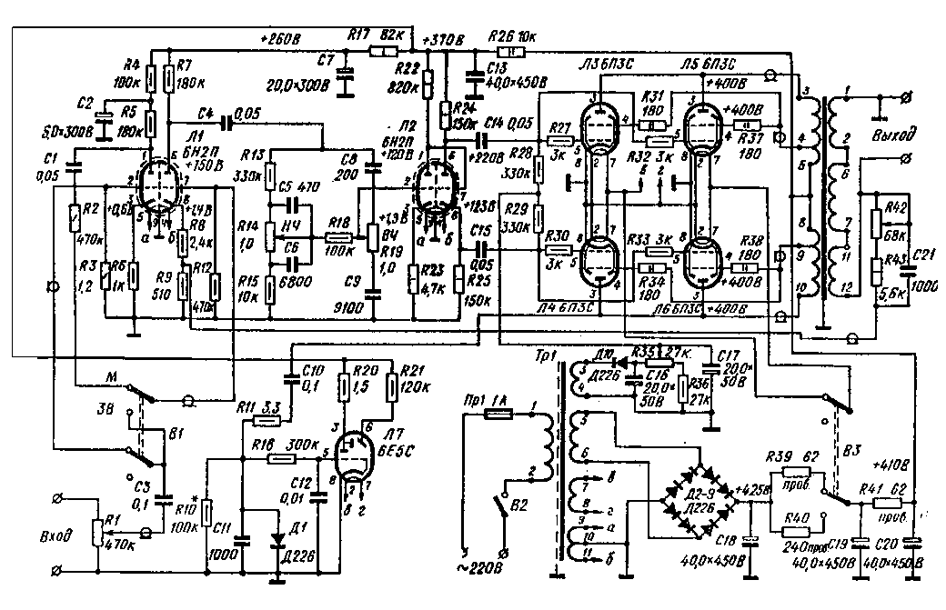 Микрофонный усилитель собран на левом триоде лампы Л1. С нагрузки этого каскада через конденсатор С1 и переключатель ”Микрофон-звукосниматель” (В1) сигнал поступает на сетку правого триода Л1. В цепь катода (R9) второго каскада подается сигнал отрицательной обратной связи с выхода УНЧ (резисторы R42, R43 и конденсатор С21). Таким образом, весь усилитель охвачен глубокой отрицательной обратной связью, значительно снижающей нелинейные искажения.