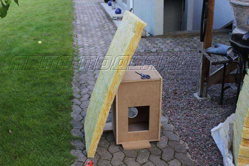 Теперь пришло время, заполнения стекловатой. Это увеличит виртуальный объем, что приведет к лучшему звучанию.