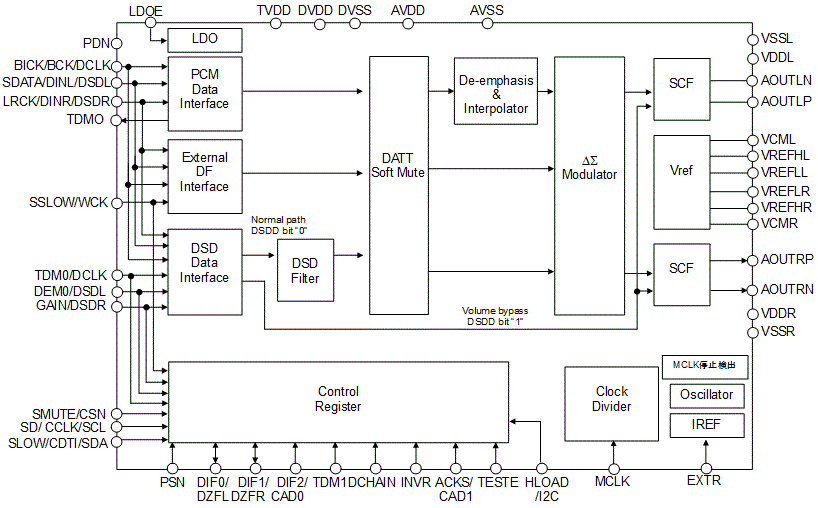AK4495S интегрирует недавно разработанную схему для создания богатого звукового поля и представления басов, что обеспечивает воспроизведение музыки с меньшими искажениями. Для обеспечения качества звука контакты VDD, VREFH, VSS и VREFL присваиваются каждому каналу L и R. В дополнение к этим, каждый из этих L и R каналов имеет две метки, чтобы избежать влияния общего импеданса и достичь низкого импеданса производительности как можно больше.