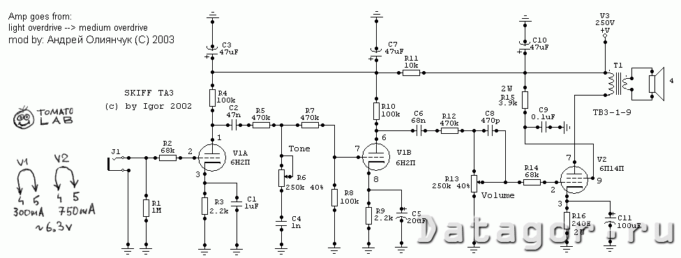 В схему P1 теоретически, а потом и практически были внесены нужные изменения: 1. С16 — 1 мкф 2. R24 – 2.2k 3. R21 – 510k (это позволило увеличить глубину перегруза) 4. Проводил эксперимент с C12, устанавливая танталовый, 10 мкф – существенных изменений замечено не было 5. Заменил темброблок на Маршаловкий, который, как мне показалось, даже лучше трехполосника 6. Катодный резистор у 6П14П, как в Скиффе-240 Ом 7. R8 – 48k 8. В связи с тем, что выходной трансформатор имеет отвод на первичной обмотке для подключения 9 ноги выходной лампы, R7 исключен, хотя в начальном варианте был подключен и звук был нормальный.