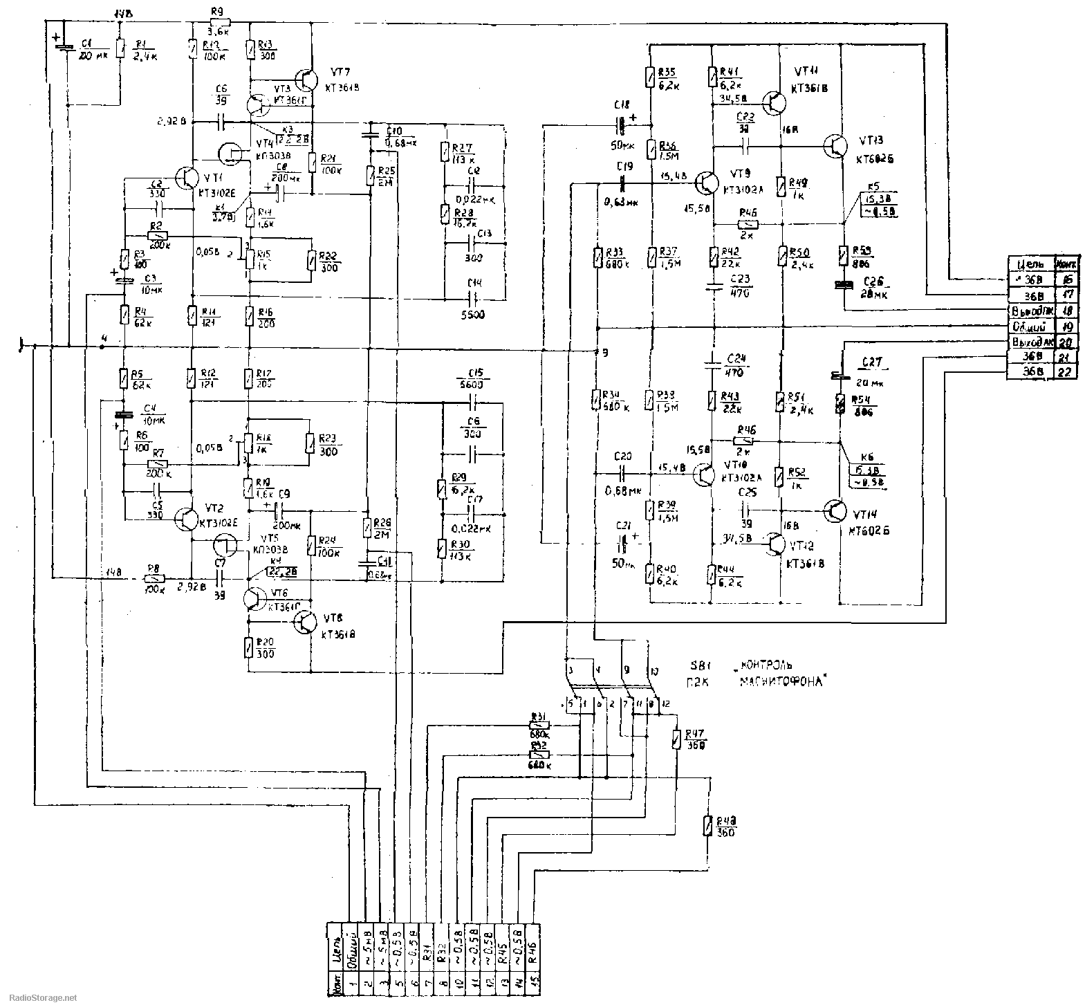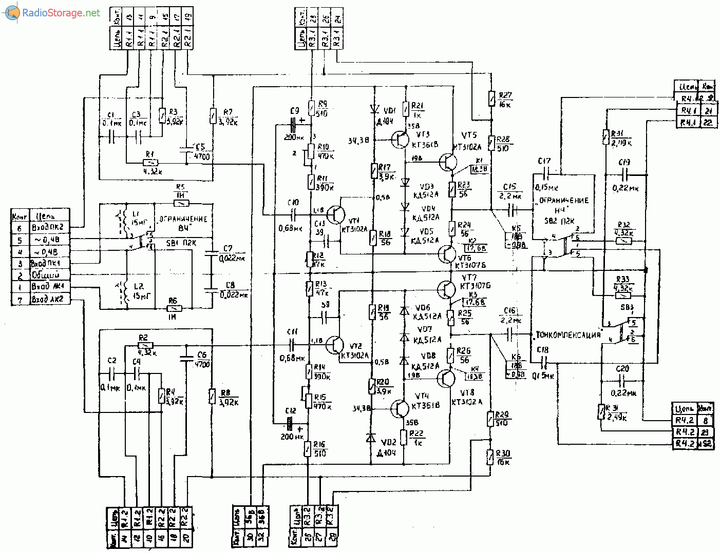 Здравствуйте. За регулировку баланса отвечает сдвоенный переменный резистор с сопротивлением 2,2К. На общей схеме он подключен к блоку «УТ» и обозначен как R3.1, R3.2. Если на замену нет такой детали с сопротивлением 2,2 кОма, то здесь можно применить близкий по номиналу — 4,7К, 6,8К и даже 10К.