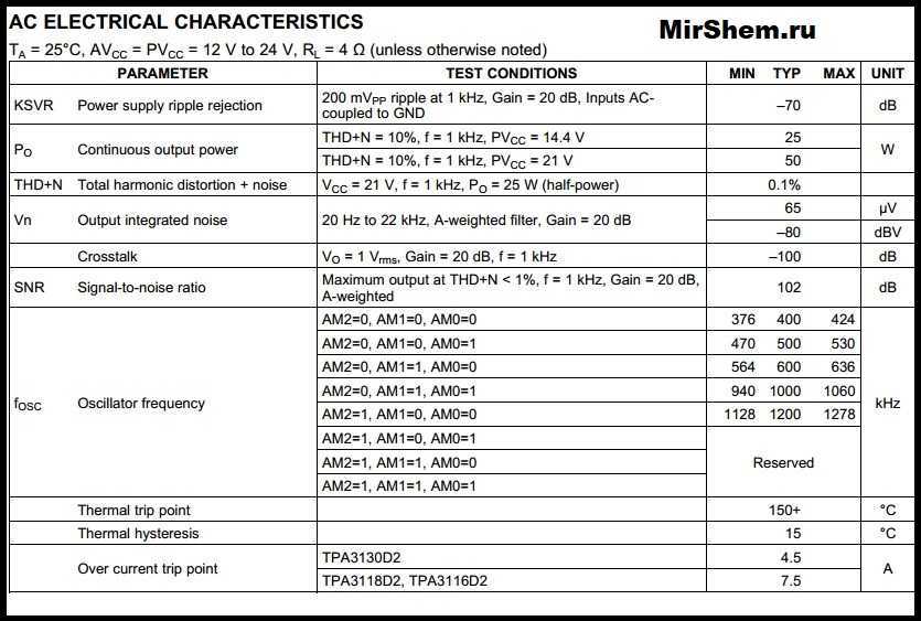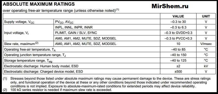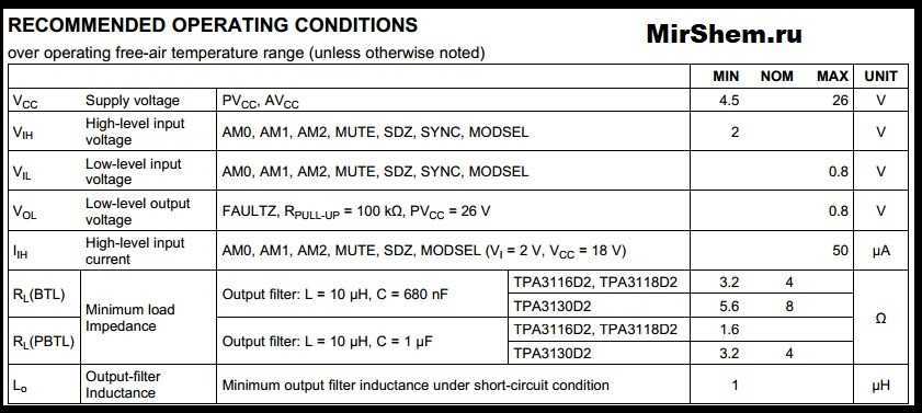 Предельные значения основных эксплуатационных характеристик tpa3116d2: