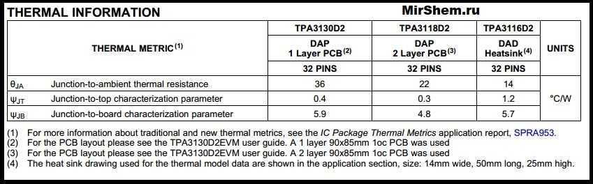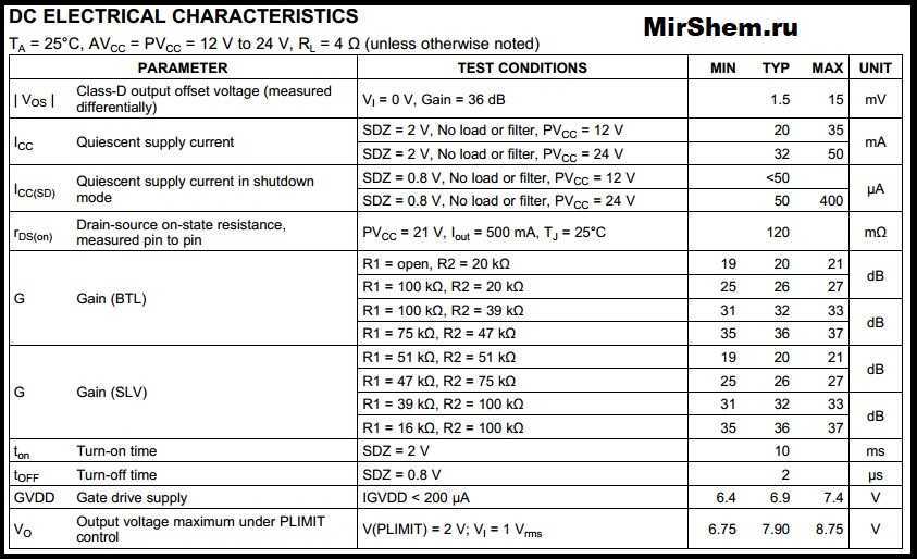 Характеристики интегральной микросхемы TPA3116D2, так же как и для транзисторов, делятся на две категории: максимально допустимые и электрические. Рассмотрим предельно допустимые характеристики. Все данные получены путем тестирования при температуре окружающей среды +25ОС, если для конкретного значения не указаны другие условия.