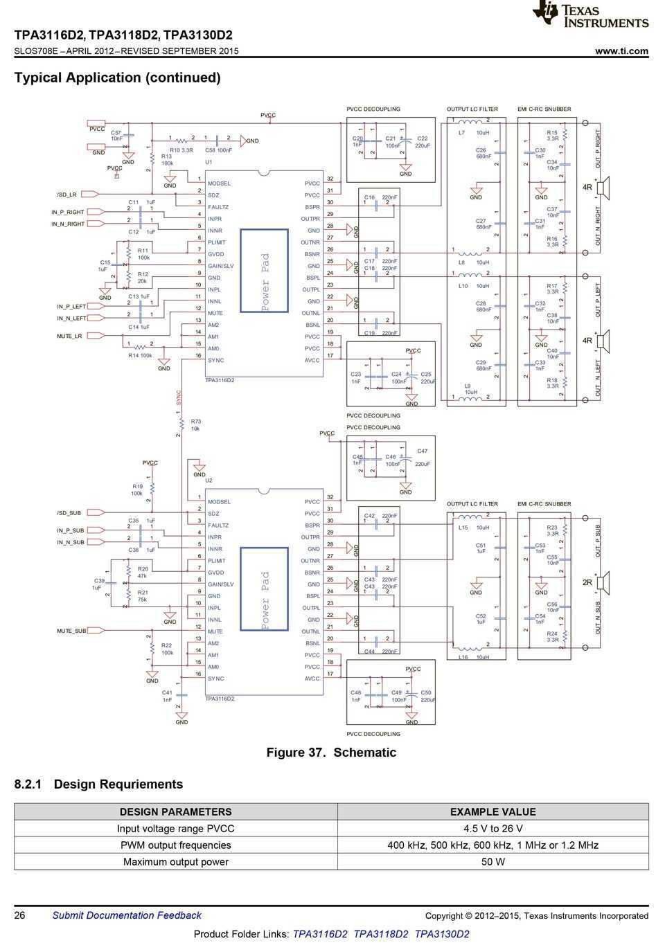Такие усилители мощности подходят для использования с сабвуферными динамиками и имеют очень хорошие характеристики. Усилитель мощности TPA3116D2 также имеет широкий диапазон напряжений от 5v до 24v и рекомендован для схемы сабвуферного УМ, использующей эту микросхему TPA.