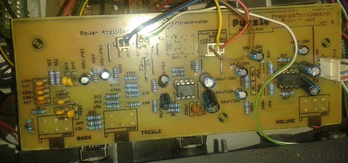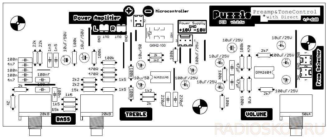 На входном каскаде предварительный усилителя собран буфер, затем регулировка тембра с возможностью его отключения с помощью реле, то есть с функция Direct. Реле может управляться подачей напряжения на его контакты от любой автоматики или кнопки. Реализация этой задачи зависит от нашего воображения, можете использовать микроконтроллер, расположенный в усилителе. Тут регулировка тембра невелика и находится в пределах, может быть слишком малых для людей, которым нравится глубокий бас. Этот предусилитель ориентирован скорее на тех людей, которые лишь слегка регулируют цветовой тон, чтобы немного облегчить прослушивание.
