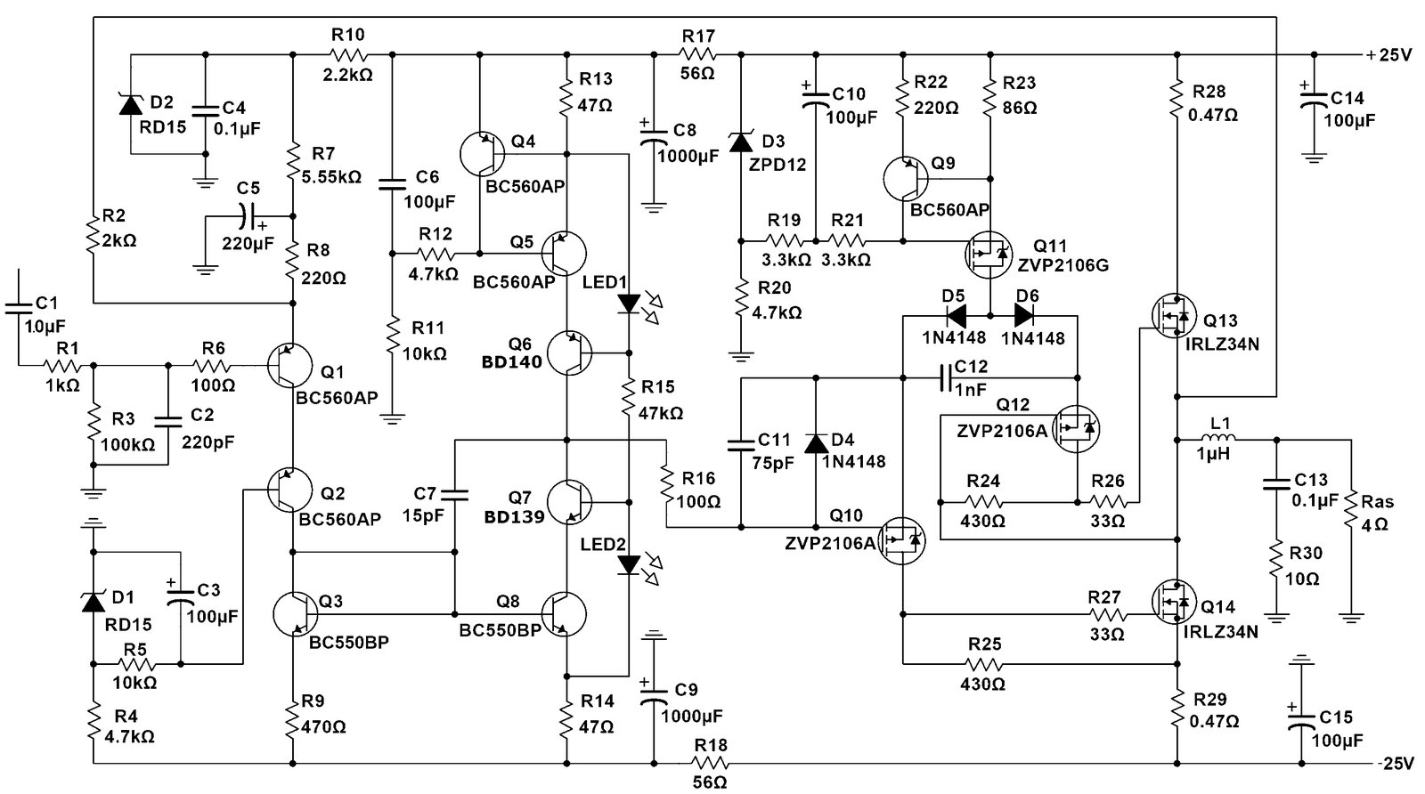 В отличие от предыдущей версии усилителя Василича с N-канальным выходным каскадом Никитина в новой схеме я отказался от блока питания с плавающей средней точкой. Это позволило значительно улучшить качество воспроизведения низкочастотного диапазона ЗЧ и исключить возможную генерацию на ультранизких частотах при сложной нагрузке. Также мною был модернизирован усилитель напряжения (я отказаться от токового зеркала Вилсона в пользу схемы с плавающим каскодом), что значительно увеличило скорость нарастания выходного напряжения. В связке с новым усилителем напряжения работает, хорошо себя зарекомендовавший, улучшенный N-канальный выходной каскад Алексея Никитина (Q9-Q14) В качестве выходных транзисторов использован IRLZ34N (N-канальный MOSFET с пороговым напряжением на затворе +1. +2В). Схема нового усилителя мощности звуковой частоты приведена ниже.