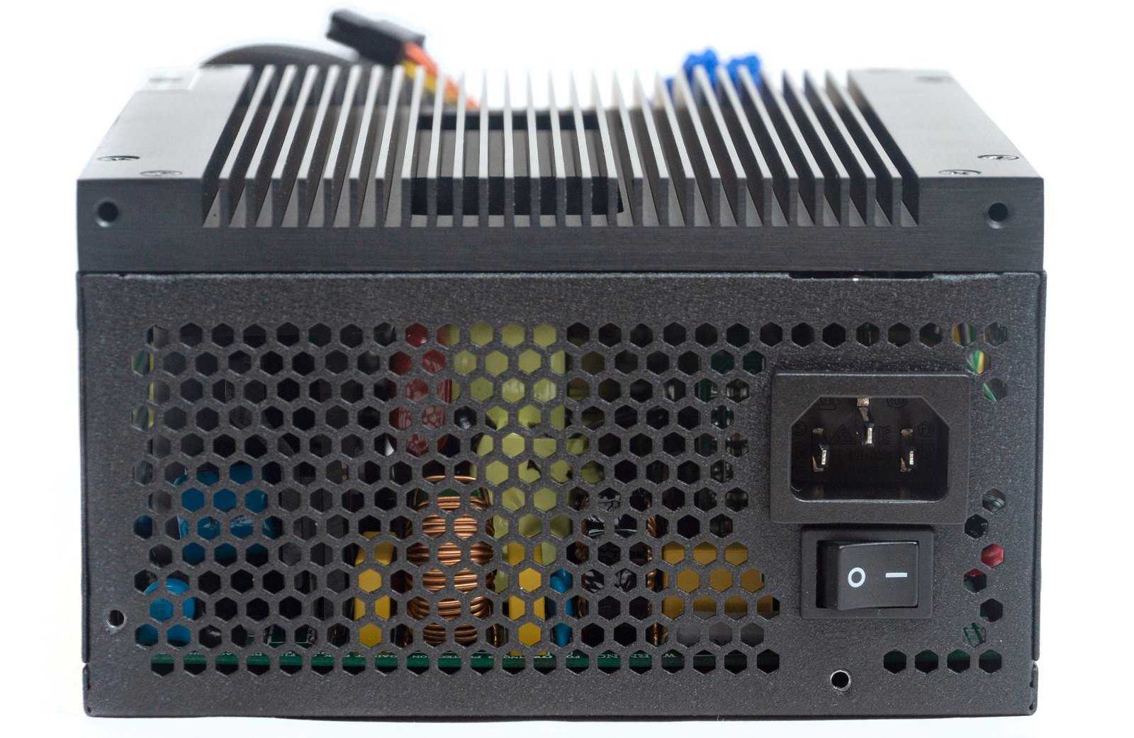 Тыльная панель также перфорирована, здесь мы видим стандартный тумблер включения и сетевую розетку.