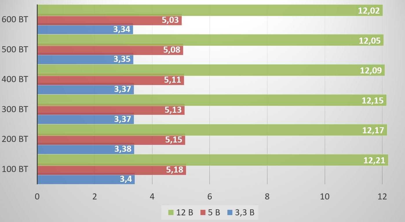 Тестовый стенд позволяет нагружать линию +12 В с шагом в 100 Вт. Линии +3.3 В и +5 В подключались к постоянной нагрузке в 50 Вт.