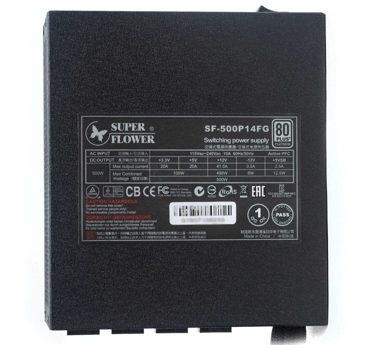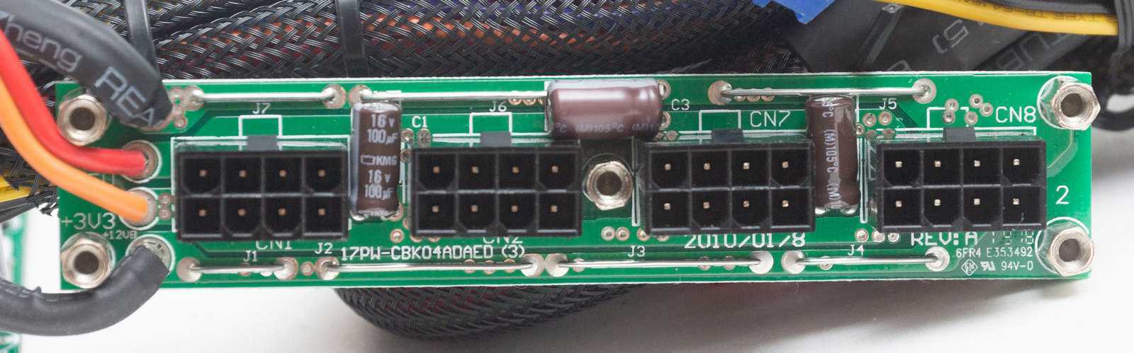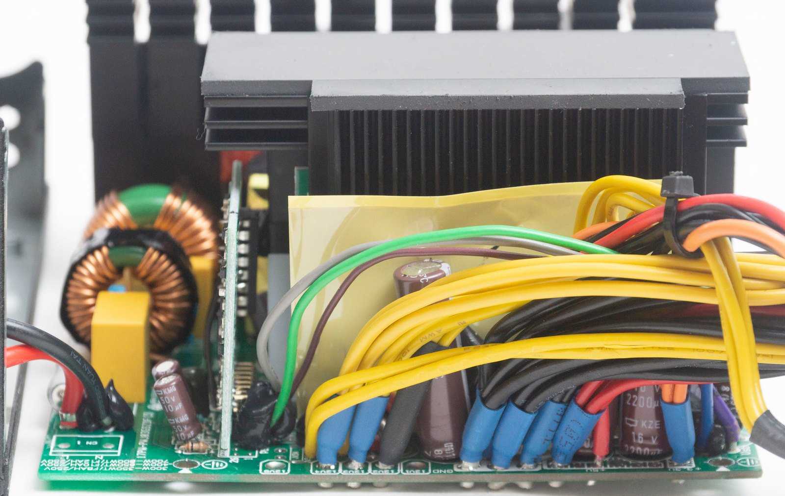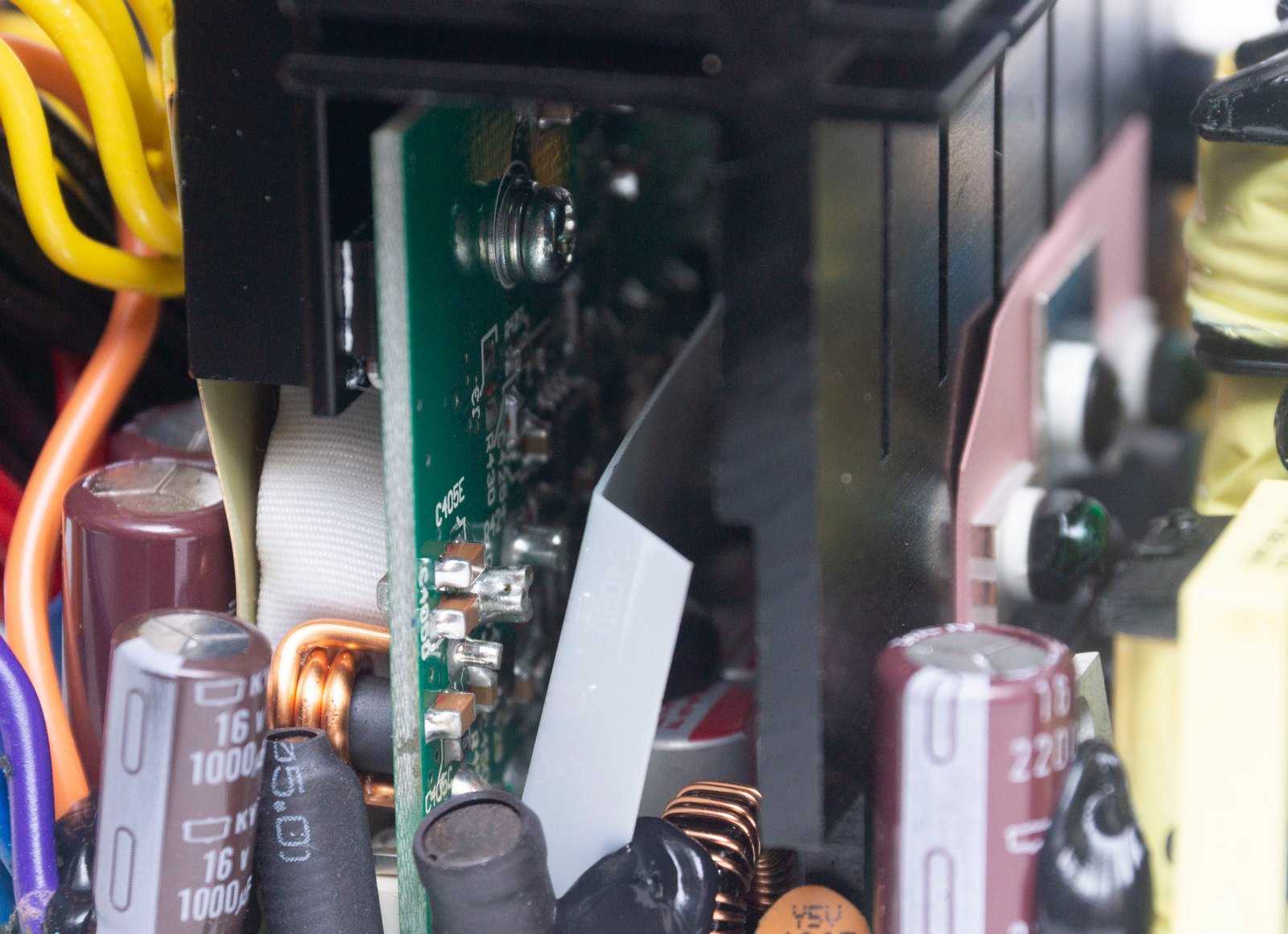 Но с другой стороны, как пользователю, нам бы хотелось видеть более современное исполнение. Полностью модульные блоки питания, даже меньшей длины, уже далеко не редкость. Использование проводов для подключения платы с разъемами также уже редко встретишь. Отсутствие элементарного варистора в схеме защиты нам не понятно. Напряжения хоть и вписываются в стандарт, но отклонение в 4% по линии +5 В – большая цифра для современного блока питания с платиновым сертификатом.