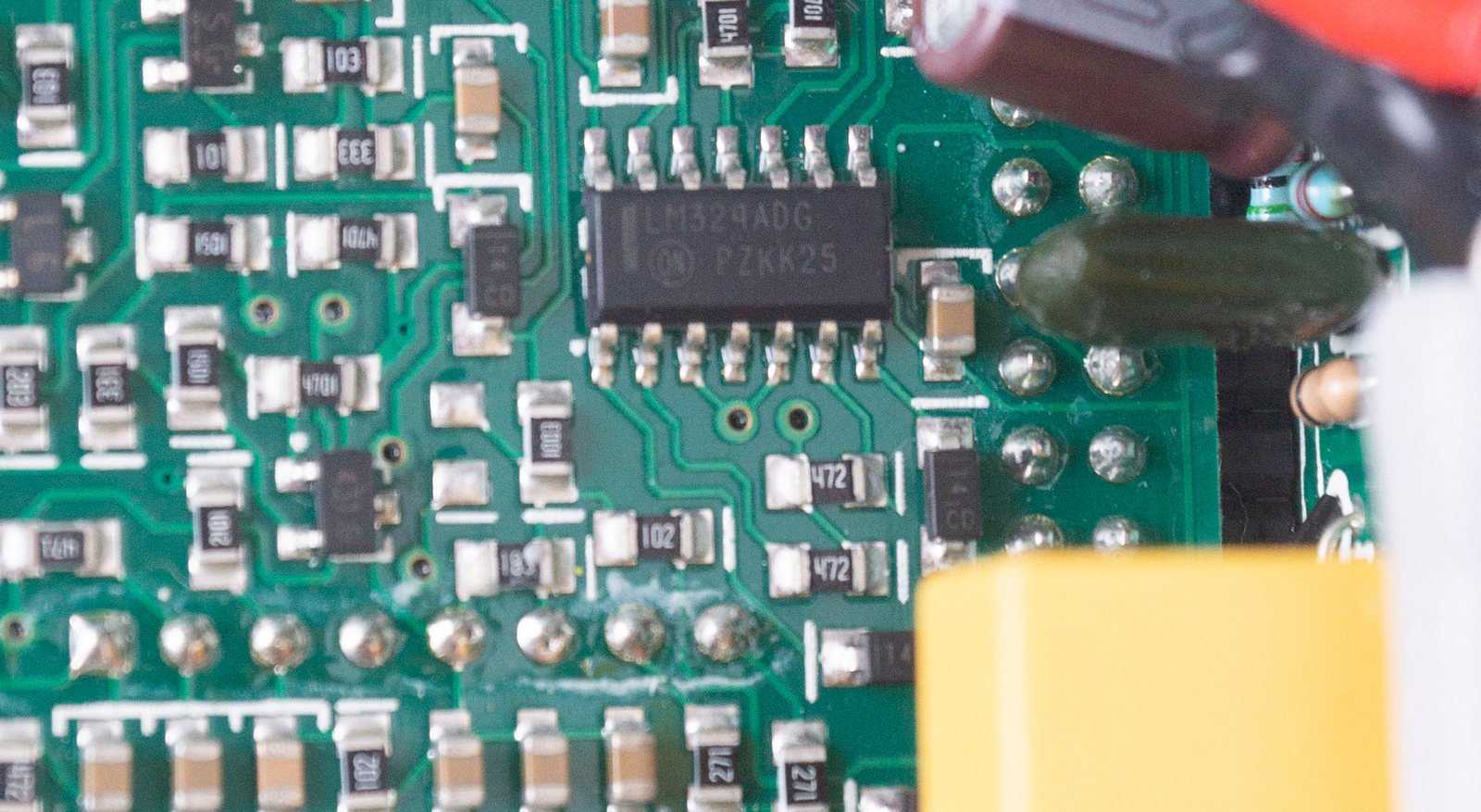 С другой стороны вертикальной платы находится микросхема ON Semiconductor LM324ADG на основе четырех операционных усилителей, она отвечает за все виды защиты и регулировку выходных напряжений.