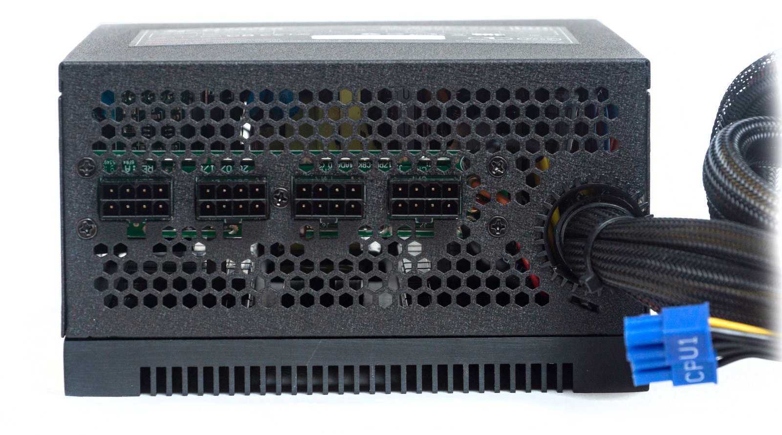 На лицевой панели, кроме вентиляционных перфораций, имеется круглое отверстие с пластиковым кольцом для вывода кабелей и четыре разъема 8-пин для подключения модульных кабелей.