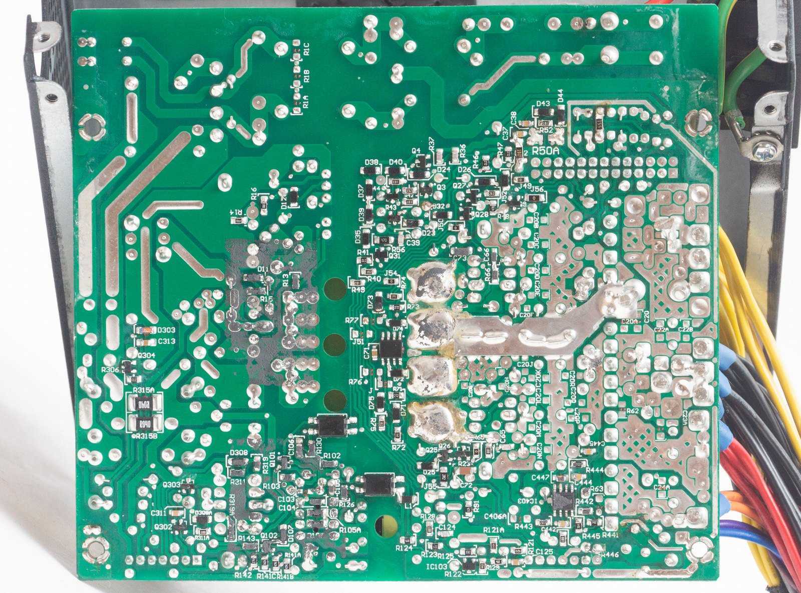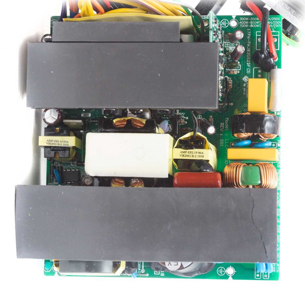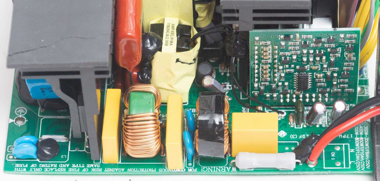 Дроссель APFC расположен на плате не перед, а за основным конденсатором, что нетипично. Между ними находится термистор защиты от пускового тока и реле для его отключения.