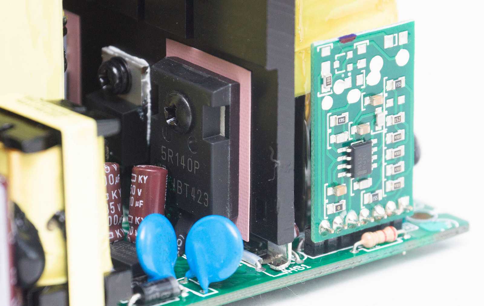 В корректоре используется один транзистор IPW5R140P и повышающий диод. Управляет корректором микросхема NCP1653A на собственной вертикальной плате.