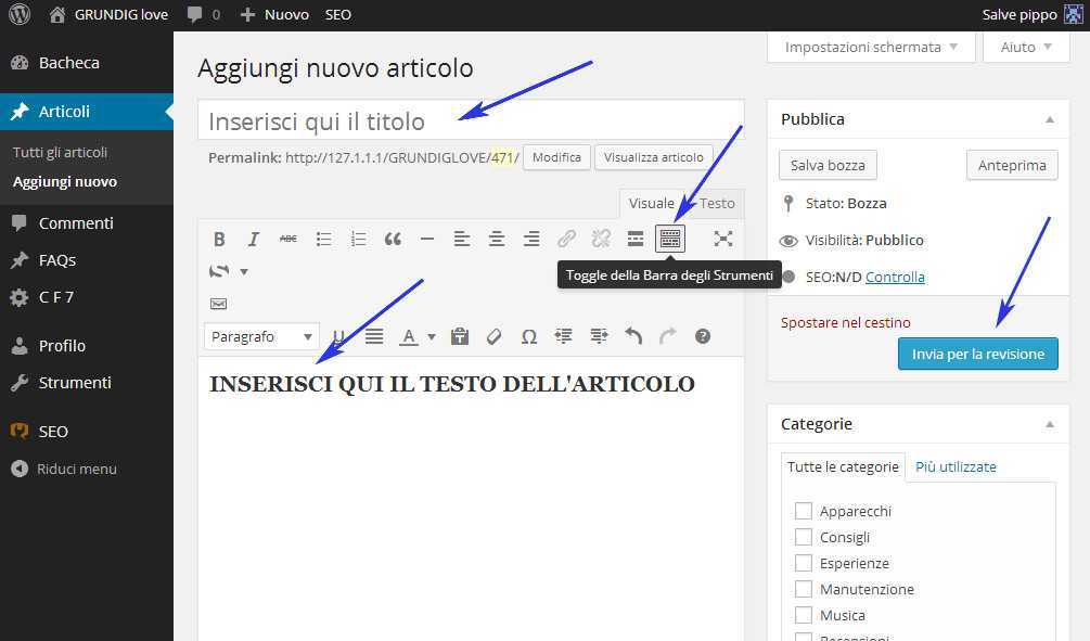 Ti ritroverai in bacheca dove potrai aggiungere un nuovo articolo semplicemente con un click del mouse sul menu «Articoli». L’immagine sotto mostra chiaramente che sono 4 le cose semplici da fare: