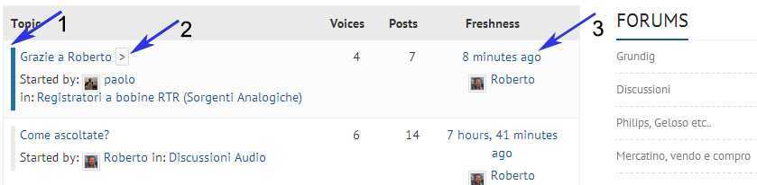- La barra verticale diventa colorata se nel topic, o nel forum, vi è un nuovo inserimento, o reply. Altrimenti la barra rimane grigia.