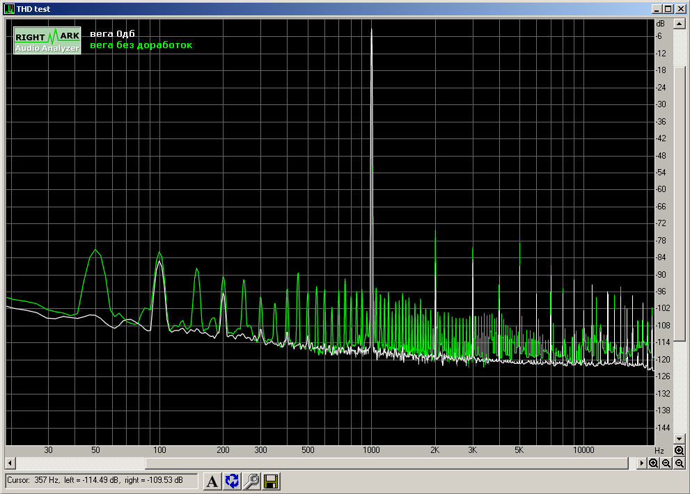 Тестирование проводилось с использованием звуковой карты Creative Audigy 4 в режиме Loop программой RMAA 5.5. ОУ на выходе карты заменен на AD826. Вход Веги — магнитофон 1, чувствительность 500мв, на выходе 2 нагрузочных проволочных резистора сопротивлением 5,6 Ом с делителем обеспечивающим номинальный сигнал на входе звуковой карты. Немного о эмпирических единицах – 0Дб — 22в 43вт -10Дб — 7в 4,37вт -20Дб — 2,2в 0,43вт Как видно на резисторе 5,6 Ом теперь может выдать амплитудное значение 22 вольта, мощность 43 Вт на канал, а тестировались сразу 2 канала. Неплохо, 86 честных Ватт с такого усилителя, хотя в пике и больше 100 Вт даст.