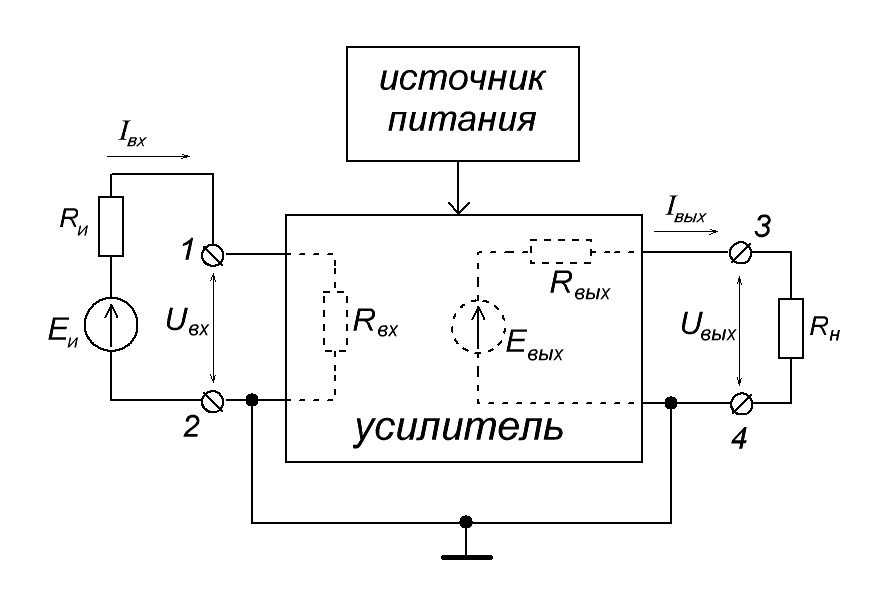 Как мы можем видеть на схеме, ко входу усилительного каскада через клеммы 1 и 2 подсоединяется какой-либо источник слабого сигнала с ЭДС EИ и внутренним сопротивлением RИ . Именно этот слабый сигнал с этого источника мы будем усиливать. Далее, как и полагается, каждый усилитель обладает своим каким-либо входным сопротивлением Rвх . Сила тока Iвх в цепи EИ —>RИ—>Rвх , как ни трудно догадаться, будет зависеть от входного сопротивления усилительного каскада Rвх .