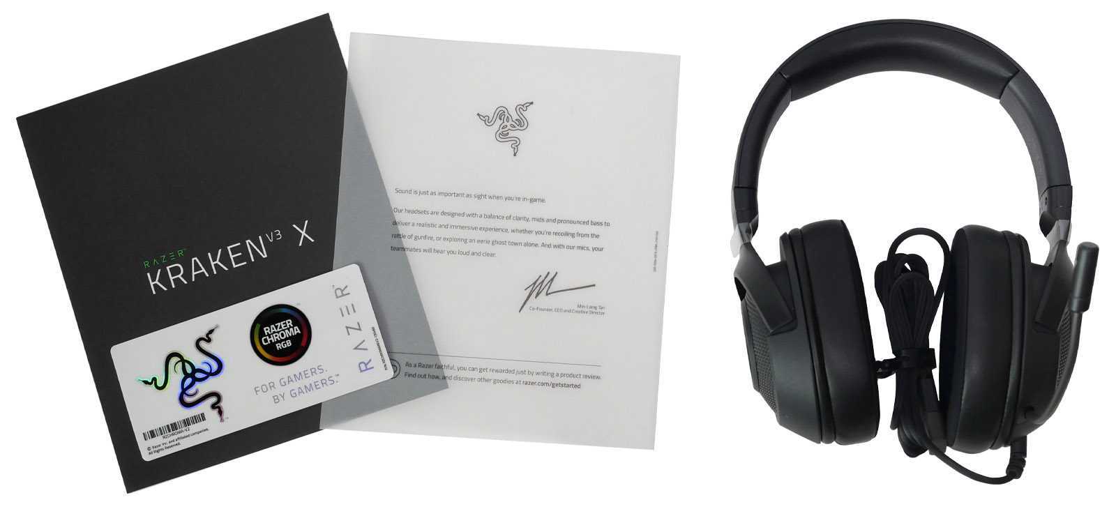 Комплектация Razer Kraken V3 X достаточно скромная и включает в себя только упомянутые документы плюс фирменные наклейки с голографическим эффектом.
