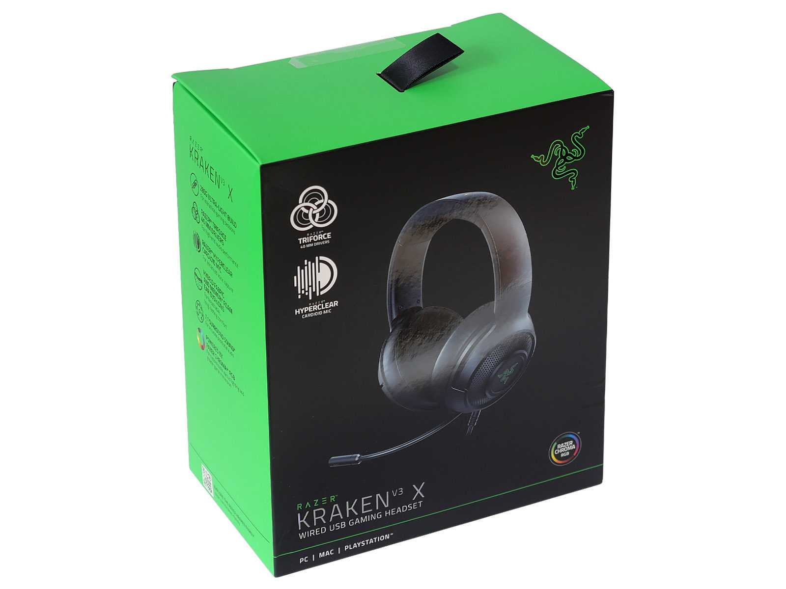 Коробка с игровой гарнитурой оформлена в привычной для Razer гамме, которая цепляет взгляд ярким зелёным цветом. Размеры: высота — 236 мм, ширина — 194 мм и толщина — 115 мм. Блистерного окошка для оценки дизайна наушников без вскрытия упаковки нет, но это компенсируется фотореалистичным изображением на лицевой стороне. Сверху коробка опечатана фирменным стикером на вскрытие.