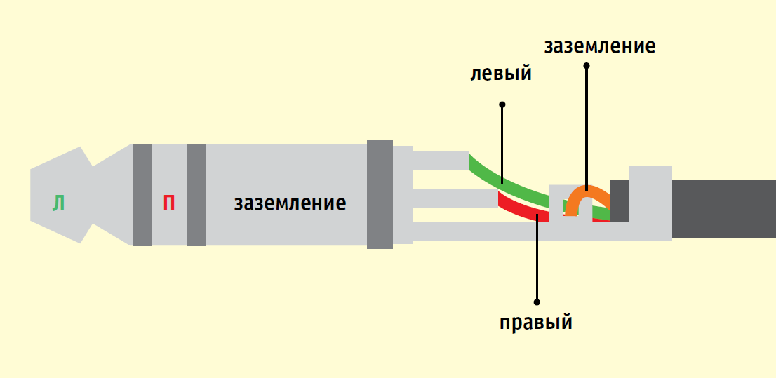 Перед тем, как приступить к пайке, полезно изучить конструкцию контактного штекера стереонаушников. Внизу предлагаем ее схематичное изображение. Кабель наушников содержит три провода: правый канал (обычно красного цвета), левый канал (зеленый, белый или желтый) и заземление (в нашем случае цвета меди).