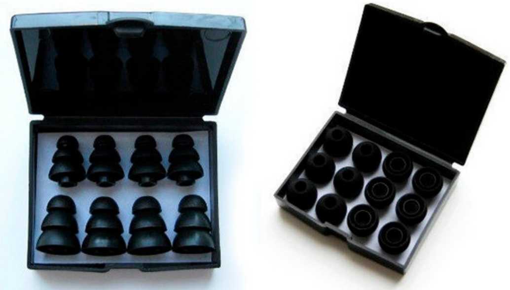 Данный вид аксессуара имеет 2 специальные насадки – «елочки» или лепестки, отличающиеся по диаметру, и в этом состоит их отличие от стандартных моделей. Лучшая шумоизоляция повышает качество звучания. Она обеспечивается именно наличием 2 насадок, использовать их можно даже в условиях с высоким уровнем шума. Однако такие амбушюры не создают полного комфорта и при долгом ношении вызывают легкие неприятные ощущения.