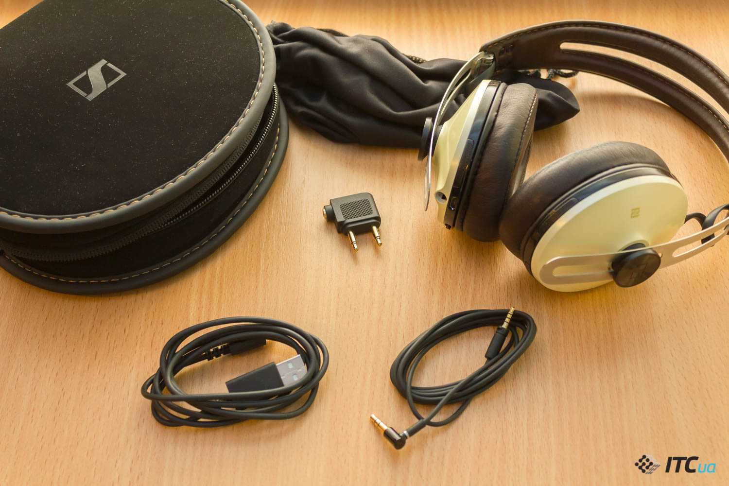 При покупке довольно дорогих наушников, а пара таких Sennheiser как раз стоит около $399, хотелось бы получить приятный набор сопутствующих аксессуаров. Вместе с Momentum M2 есть кабель для зарядки, кабель для проводного подключения звука (2.5-to-3.5 мм), переходник для самолетных разъемов и приятный бархатный чехол, который хоть и не жесткий, но при транспортировке не помешает. Еще внутри есть тканевый «мешочек», который может быть полезным в поездках, когда место в сумке/рюкзаке сильно ограничено. Но защитной функции у него почти нет (разве что от мелких царапин спасет). В остальное время он практически бесполезен.