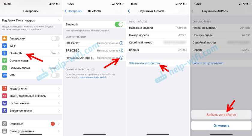 - Если всё ещё подключается только 1 наушник AirPods, нужно удалить устройство из списка «запомненных». 6.1. На iOS (iPhone): Настройки –> Bluetooth –> нажимаем ‘i’ в строчке AirPods – > Забыть устройство, подтверждаем. 6.2. На Android всё аналогично: открываем устройства Bluetooth, выбираем AirPods и удаляем. Скорее всего, конечно, нужнее именно инструкция для iPhone.