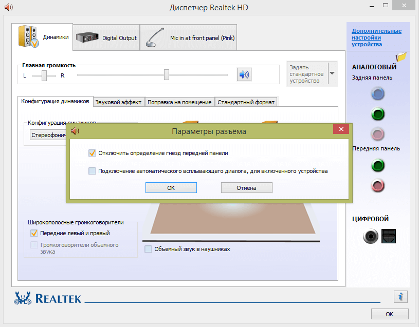 - Поставить галочку напротив первого пункта «Отключить определение гнезд передней панели». Если таковая имеется, то нужно пропустить действие и сразу нажать на «Ок».