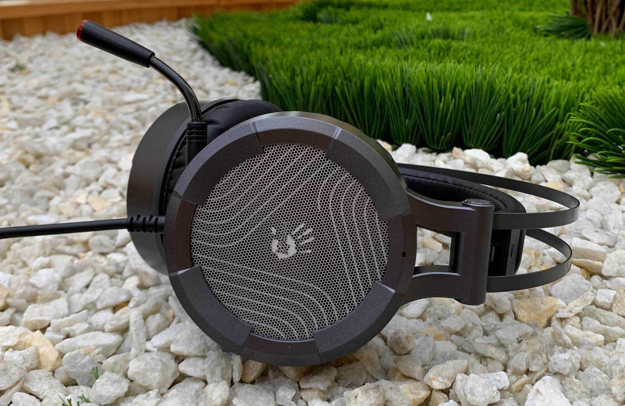 На обеих чашах с глянцевым покрытием имеются фигурные вырезы под светодиодную подсветку, которая активируется при подключении через USB-порт. Пластик чаш не выделяется особым качеством, но сборка наушников и их прочность вызывает доверие.