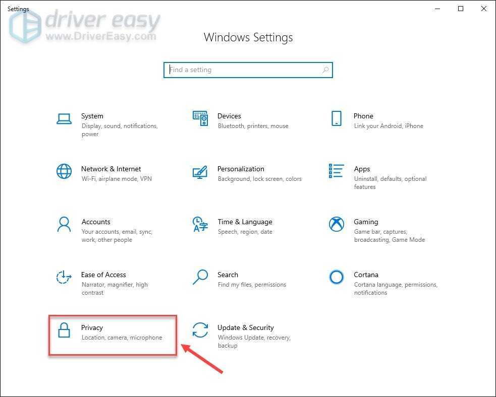 - Когда настройки Windows станут видимыми, выберите «Конфиденциальность».
